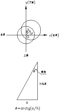 有效孔径:指用弹性导中器加浮体法测孔斜值x和y的大小(图3)。在孔口建立一个平面坐标体系,(图4)从孔口或孔底每1米或2米测一个值x和y,用钻孔的直径画园。这样每1米或2米作园投影到孔平面。N个(孔深)园相交的内切园就为有效孔径。如图2的红线园。因此孔越深,孔的四个方向的偏离值越小,这样的孔就越垂直。